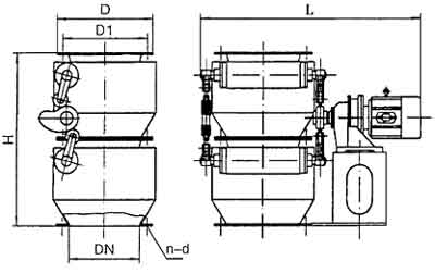 | DN | D1 | D | H | H1 | L | n-d | 卸灰能力m3/h | 傳動(dòng)裝置型號(hào) | 開閉頻率次/min | 功率kw |